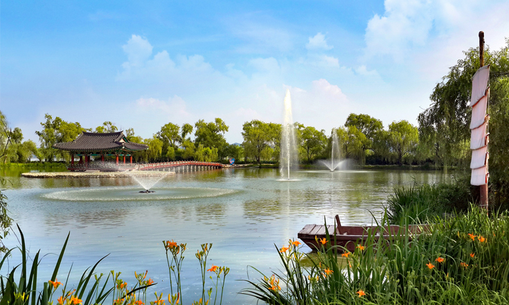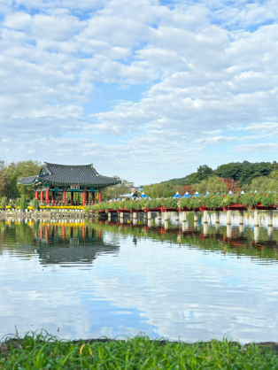 Gungnamji is the first artificial pond in Korea, boasting a history of approximately 1,400 years. Although it has been restored, remnants of an island in the center of the pond remain, suggesting that it was once much larger. The wooden bridge leading to the island and the pavilion situated on it, reflecting beautifully on the water, enhance the pond's charm. These features contribute to the pond's renowned night view, which is particularly stunning when illuminated by sparkling lights. Gungnamji is a picturesque tourist destination that captivates visitors in all four seasons. In July, countless lotus flowers bloom, while from October to November, a chrysanthemum exhibition takes place, adorning various areas of Gungnamji with an array of artistic displays. Enjoy a leisurely stroll around this historic pond, nestled within a tranquil and serene park!