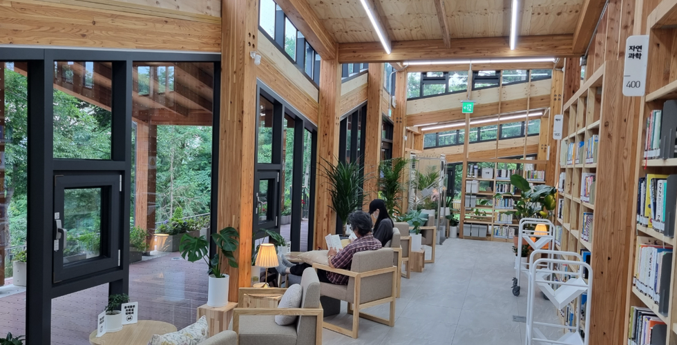 Odong Public Library, located in Odong Neighborhood Park in Seongbuk-gu, is a nature-friendly library where you can enjoy the beauty of nature within the city. Designed to reflect the flow of the park’s trails, this wooden building offers various spaces that blend harmoniously with the surroundings. The roofs are built at different heights, allowing natural light to pour in through the gaps, and window seats with views of the forest are available inside. While the plants placed throughout the building create a refreshing atmosphere, the seats by the windows, which feel as if you're in the forest, are especially popular even on weekdays. From the cozy, book-filled interior to the outdoor paths around the building, it’s a healing space worth exploring slowly. This place, once a dusty and noisy wood crushing site, has now become a perfect resting spot and walking path for citizens!